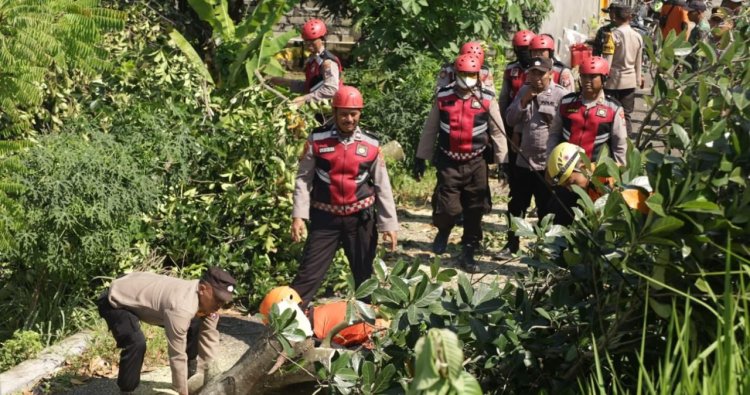 Puluhan personel Polres Tuban bersama BPBD dan unsur terkait langsung terjun ke lokasi untuk membantu proses evakuasi, pembersihan puing-puing bangunan, serta membantu warga membersihkan pohon yang mengganggu akses jalan.